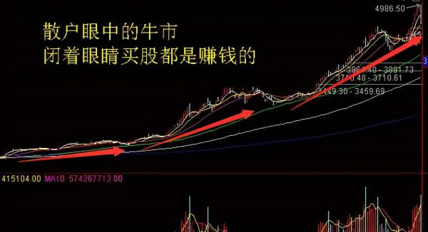散户眼中的牛市就是那种行情非常好,赚钱效应非常高的,闭着眼睛买的行情就是牛市;只要散户买股票出现亏损,就认为不是牛市,而是熊市。