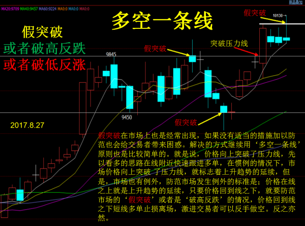 假突破在市场上也是经常出现,如果没有适当的措施加以防范也会给交易者带来困惑。解决的方式继续用‘多空一条线’原则也是比较简单的。就是说,价格向上突破了压力线,先以看多的思路在线附近快速跟进多单,在惯例的情况下,市场价格向上突破了压力线,就标志着上升趋势的延续,但是,市场也有例外,防范市场发生例外的标准是:价格在线之上就是上升趋势的延续,只要价格回到线之下,就要防范市场的‘假突破’或者是‘破高反跌’的情况,价格回到线之下短线多单止损离场,激进交易者可以反手做空。反之亦然。