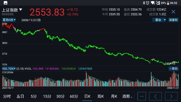 例如下图的牛市k线显示红色,熊市k线显示绿色,这样就一目了然了