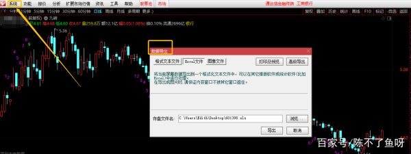 弹出该股票界面后,同样切换到”日K“,再点击左上角的系统--数据导出,选择Excel文件进行导出并保存。这样,该股票的历史收盘价表格就下载好了。如下图所示: