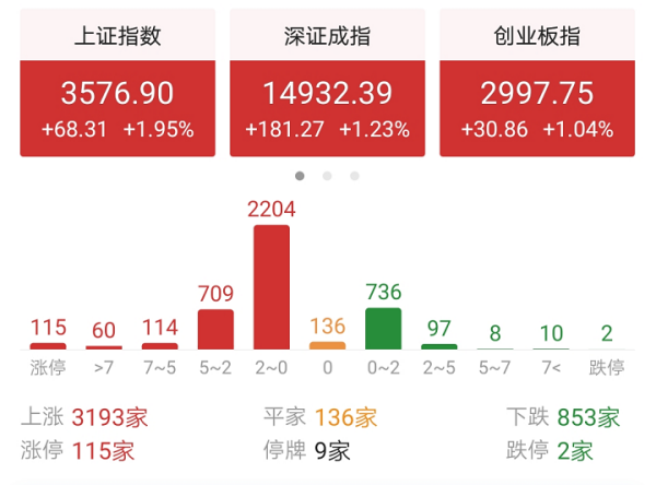 截止收盘,上证指数收涨1.95%,深圳指数收涨1.23%,创业板指数收涨1.04%,三大指数全线上涨,尤其上证指数出现单边大涨。个股方面上涨个股高达3193家,下跌个股只有853家,红盘率高达85%;其中涨停个股115家,跌停个股有2家,总体涨多跌少,权重股全面大涨,中小题材股普通的行情。