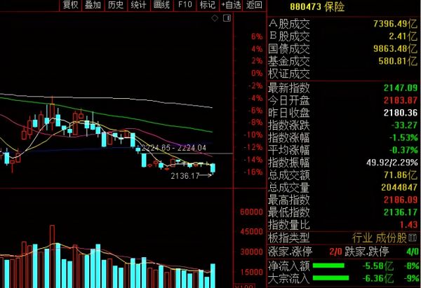 当然并非保险板块在走跌,银行板块和证券板块也太弱,总之就一句话整个金融板块都走跌,成为A股下跌的第二大空头,也是砸盘者之一。
