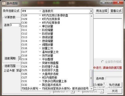 最后一步,使用自己的自编公式选股,单击 功能-->选股器-->条件选股(快捷键ctrl+T),打开如下画面,在“条件选股公式”下拉框中找到自己的自编公式,单击“加入条件”,完毕之后就可以单击“执行选股”,根据公式复杂程度不同,一般经过1~10分钟后可以得到自己的选股结果,小伙伴们,快去体验下吧,以后股海沉浮是不是又多了一个利器啊。。。