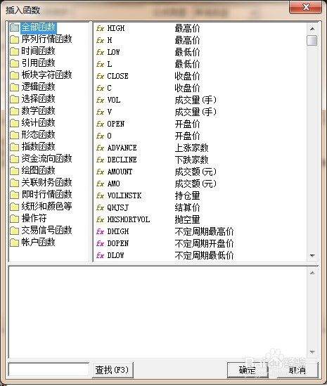 创建公式过程中最重要的是对通信达函数的使用,可以点击“插入函数”打开如下画面,通达信会对每个公式的功能与使用方法进行简单介绍,熟悉之后试用起来非常方便。