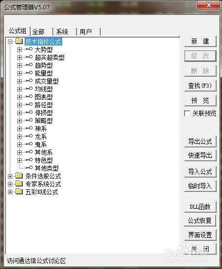 单击 功能-->公式系统-->公式管理器(快捷键ctrl+f),打开如下画面,选中“条件选股公式”,单击“新建”,就可以创建自己的选股公式了。