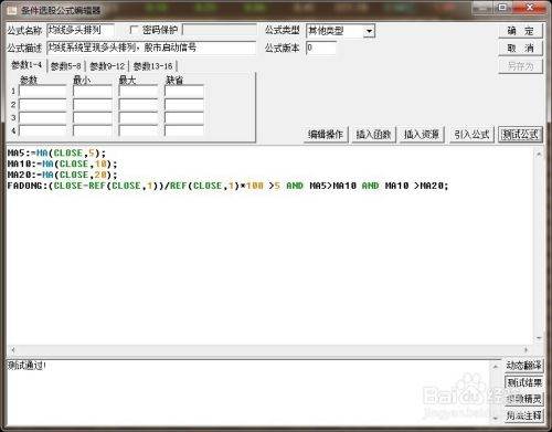 上述步骤打开公式编辑器后显示如下画面,在“公式名称”中给自己的公式取名字,在“公式描述”中可以进行相关提示,便于后续公式管理与使用。通达信内置了非常丰富的公式与函数可供直接引用;在公式编写完毕之后需要单击“测试公式”,若系统提示测试通过则可以直接使用。若有错误,系统也会给出相关提示。本例给出的公式代码: