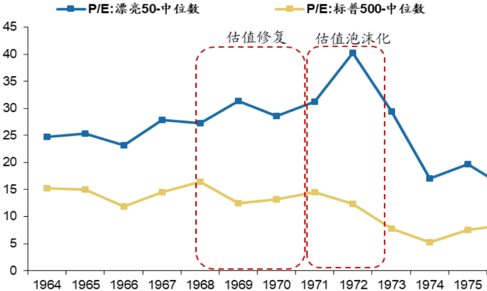 自1971年开始,“漂亮50”股价和估值水平迅速抬升,1972年底估值中位数超过40倍,最高的宝丽来公司估值甚至超过了90倍,而同期标普500估值中位数仅为12倍。