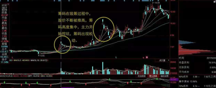 ②从双峰密集到单峰密集:主力吸筹的“挖坑”形态