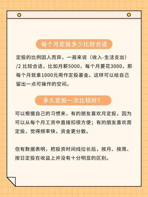 定投的比例因人而异,一般来说(收入-生活支出)12 比较合适,比如月薪5000,每个月要花3000,那每个月就拿1000元用作定投基金。这样可以给自己留出一点可操作的空间。