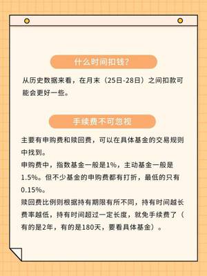 同时,在进行定期定额基金投资时,投资者还可以选择后端申购,即在申购基金时不支付申购费,而在赎回时支付。这样,持有基金年限越长,申购费率越低,直至为零。专家同时提醒投资者,定期定额购买基金的方式关键是要坚持,只有坚持长期投资,才能摊薄成本,获得高收益。因此,选择这种投资方式,就要做好长期投资的心理准备。