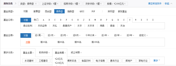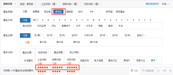 1、机构评级(全五星)。打开天天基金网找到基金筛选,在基金类型中选择债券型,机构评级选择全五星。