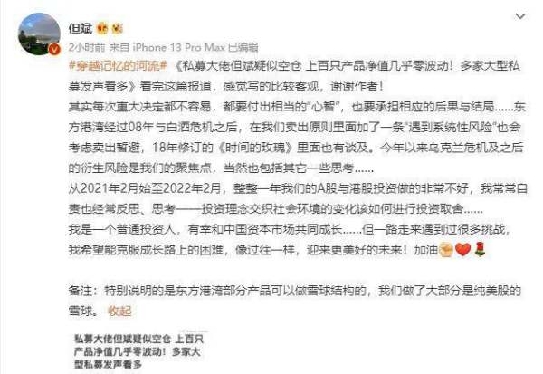 从2021年2月始至2022年2月,整整一年我们的A股与港股投资做的非常不好,我常常自责也经常反思、思考――投资理念交织社会环境的变化该如何进行投资取舍…… 但斌微博还进行了备注:特别说明的是东方港湾部分产品可以做雪球结构的,我们做了大部分是纯美股的雪球。