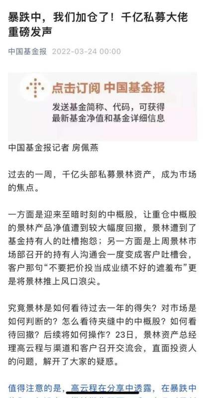 今年以来,包括东方港湾在内的不少知名私募出现较大净值波动。值得注意的是,不同的私募机构,有着不同的操作和策略。与东方港湾不同,近期市场暴跌当中,另一家千亿头部私募景林资产,近日宣布加仓。中国基金报报道,23日,景林资产总经理高云程与渠道和客户召开交流会,直面投资人的问题,高云程在分享中透露,在暴跌中他们不但没有恐慌性抛售股票,反而在几乎最低点加仓看好的企业。