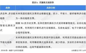 随着5G等现代技术的发展,未来我国挖掘机会朝着智能化、电子化趋势发展,自动驾驶、远程操作成为可能;同时未来挖掘机还会顺应我国环保政策,朝着更加节油环保的趋势发展。