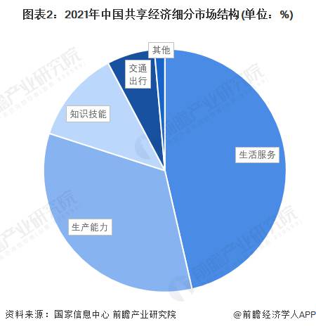 从2021年共享经济各细分市场规模占比看,生活服务、生产能力以及知识技能领域的共享经济规模排名前三,分别占到46.4%、33.5%和12.3%。