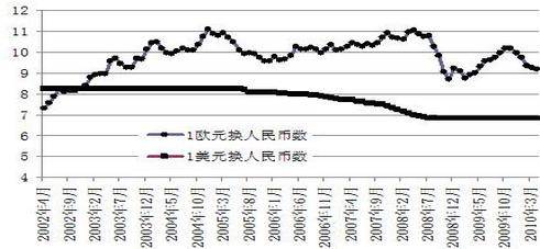 图6:人民币与欧元及美元汇率,月平均,2002年1月-2010年4月