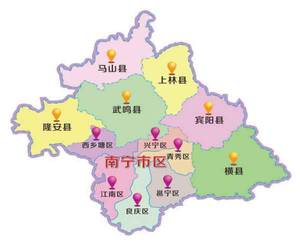 管辖区县:青秀区、兴宁区、江南区、良庆区、邕宁区、西乡塘区、武鸣区、横县、隆安县、马山县、上林县、宾阳县。