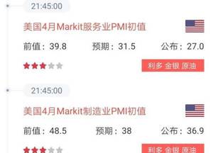 一、美国经济下行速度创历史最快记录。4月23日美国同时公布了两组重磅的数据,第1组数据就是刚才提到的初请失业金人数,第2组数据则是markit PMI指数。众所周知,PMI指数是投资者对未来经济的预期,这个指数被看作是未来经济走向的前瞻性指标,而这一次的PMI数字非常糟糕,如图。