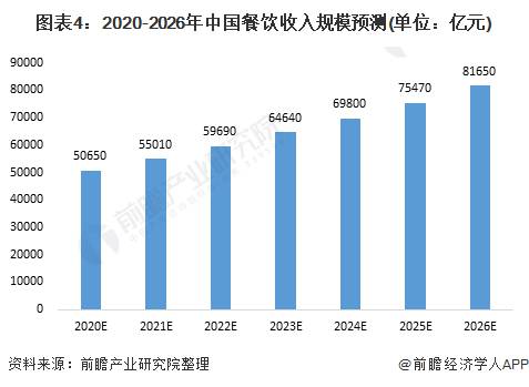未来我国餐饮业将在以人为本、服务民生的基本原则上,从自主创新、信息化经营管理、节能低碳、绿色发展、品牌战略等层面推动发展转型,优化发展结构,创新发展模式,提升服务质量,释放发展新动能。前瞻预计在中国宏观经济放缓的前提下,2020-2026年中国餐饮收入增速将保持在8.0%-9.0%之间,到2026年餐饮收入预计将达到81650亿元左右。