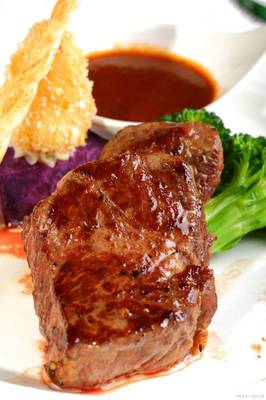英文STEAK一词是牛排的统称,其种类非常多,常见的有以下四种:嫩牛柳,牛里脊,又叫菲力,是牛脊上最嫩的肉,几乎不含肥膘,因此很受爱吃瘦肉朋友的青睐。由于肉质嫩,煎成3成熟、5成熟和7成熟皆宜。肉眼牛排。瘦肉和肥肉兼而有之,由于含一定肥膘,这种肉煎烤味道比较香。食用时不要煎得过熟,3成熟最好。西冷牛排,也叫牛外脊,含一定肥油,由于是牛外脊,在肉的外延带一圈呈白色的肉筋,总体口感韧度强、肉质硬、有嚼头,适合年轻人和牙口好的人吃。T骨牛排。呈T字形,是牛背上的脊骨肉。T型两侧一边量多一边量少,量多的是肉眼,量稍小的便是菲力。这种牛排在美式餐厅更常见,由于法餐讲究精致,对于量较大而质较粗糙的T骨牛排较少采用。