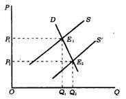 图中农产品的需求曲线D是缺乏弹性的。农产品的丰收使供给曲线由S位子向右平移到S',缺乏需求弹性的需求曲线作用下,农产品德均衡价格大幅度地有p1下降为p2。由于农产品均衡价格下降幅度大于农产品的均衡数量增加幅度,最后导致农民总收入量减少,总收入的减少量相当于矩形OP1E1Q1和OP2E2Q2面积之差。