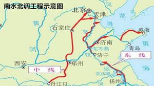 南水北调中线:从河南南阳的淅川陶岔渠调往北京。