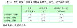 2021年第一季度,全国房价总体稳定。受上年低基数影响,商品房销售和房地产开发投资同比出现明显增长。3月,70个大中城市新建商品住宅和二手住宅价格同比分别上涨4.4%和3.3%,涨幅较上年末分别高0.7个和1.2个百分点。一季度,商品房销售面积同比增长63.8%,两年平均增长9.9%;销售额同比增长88.5%,两年平均增长19.1%。一季度,房地产开发投资同比增长25.6%,两年平均增长7.6%;其中,住宅开发投资同比增长28.8%,两年平均增长9.3%,占房地产开发投资的比重为74.8%。