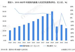根据国家统计局数据显示,2010-2019年,中国国内旅游人次逐年上升,2019年达到60.06亿人次。2020-2021年,受疫情影响,中国国内旅游人次大幅下降。2020年,中国国内旅游人次为28.79亿人次,相比2019年下降了52.06%。2021年,国内旅游总人次32.46亿,比上年同期增加3.67亿,增长12.75%。(恢复到2019年的54.0%)。根据国内旅游抽样调查统计结果,2022年,国内旅游总人次25.30亿,比上年同期减少7.16亿,同比下降22.1%。