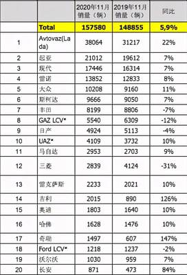 2020年11月,俄罗斯新车和轻型商用车相比于去年同期增长5.9%,俄罗斯汽车市场也开始走出之前连续多月的低迷状态,出现了小幅度增长。11月,俄罗斯市场共销售出新车157580辆,随着俄罗斯货币卢布的贬值和汽车厂商的持续降价,在很大程度上推动了汽车销量的增长。