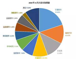 2020年6月,国内大型客车市场总销量为6416辆。1-6月累计销售客车达到2.3万辆,同比累计下降29%,下降幅度进一步缩窄。宇通客车、金龙客车、福田欧辉、中通客车等头部企业占据了65.70%的市场份额。