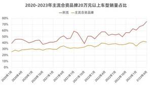 再来看别克,5月销售51,777辆的别克,同样也实现了同比和环比的增长。但另外一个数据是,如果我们看过去三年里别克与主流合资品牌20万元以上车型的销量占比趋势对比,就会发现别克一直大幅领先主流合资品牌的整体水平。并且从去年下半年开始,别克的中高端车型销量占比明显进入了新的增长期,到近两月甚至连续突破70%。