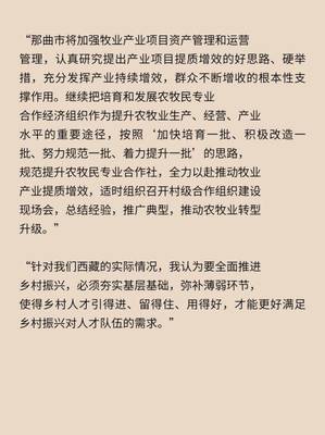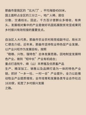 自治区人大代表,那曲市农业农村局党组副书记、局长次仁德吉介绍,近年来,那曲市坚持牧业特色促产业发展,以产业兴旺作为发展目标,按照“稳粮、兴牧、强特色”总体发展思路,因地制宜发展特色产业,做到“短中长”产业有机结合;重点打造牦牛、绵(山)羊养殖及优质畜产品生产、精深加工、销售以及品牌打造为一体的特色产业链,抓好“一乡一社、一村一合”产业提升,全力以赴推动牧业产业提质增效,全市培育和发展各类专业合作社达1630家,拓宽了乡村振兴发展之路,。