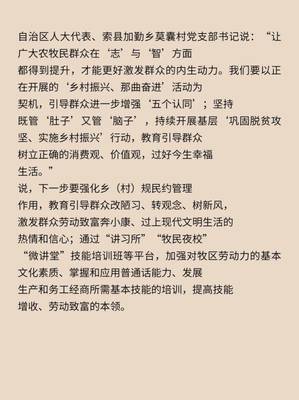 自治区人大代表、索县加勤乡莫囊村党支部书记玛尔措说:“让广大农牧民群众在‘志’与‘智’方面都得到提升,才能更好激发群众的内生动力。我们要以正在开展的‘乡村振兴、那曲奋进’活动为契机,引导群众进一步增强‘五个认同’;坚持既管‘肚子’又管‘脑子’,持续开展基层‘巩固脱贫攻坚、实施乡村振兴’行动,教育引导群众树立正确的消费观、价值观,过好今生幸福生活。”