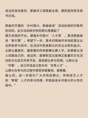 那曲市开展的‘乡村振兴、那曲奋进’活动给我的印象特别深刻,此次活动给农牧民群众搭建起了展示自我的平台,建强乡村振兴‘人才库’,激活那曲奋进‘新引擎’。希望下一步,更多的那曲市本地民营企业也积极参与其中,在活动中把准群众的关注点和利益点,从群众最喜欢、最爱看的传统歌舞比赛入手,依靠群众深入挖掘自己的、身边的、能够彰显主旋律正能量的文化活动和文化技艺传承节目,激发群众参与热情;让群众当‘评委’,自己评选自己家乡的‘优秀人才’,让群众在参与的过程中感受到被重视、被尊重、被认同,进一步提升广大农牧民群众、传统技艺人才和‘草根’人才的参与热情,积极投身乡村振兴的火热实践中。”