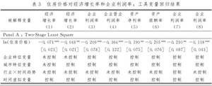 为解决内生性问题,文章选取省级人均房地产企业土地购置面积作为城市住房价格的工具变量对房价上涨的影响进行估计,主要基于两个前提:(1)省级人均房地产企业土地购置面积能影响到城市住房价格;(2)省级人均土地购置面积与式(1)与式(2)的残差项不相关,即人均土地购置面积不通过除住房价格以外的其他途径影响到经济增长与工业企业利润率,因为房地产企业土地购置主要受到地方政府和房地产市场的影响。回归结果显示,第一阶段的每列回归结果都显示人均土地购置面积与住房价格存在高度显著的负相关关系,符合理论预期与工具变量使用前提。2SLS基准模型的回归结果显示,住房价格与经济增长率、工业企业利润率存在显著负向关系。