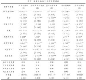 i,j,k,t分别指示企业、行业、城市与年份。Profit_ijkt表示企业利润率。从表2可知,住房价格对工业企业利润率有显著的负向影响,住房价格越高,工业企业利润率越低,支持了文章的理论预期。如第(1)列,房 价上升1倍,工业企 业利润率将下降2.2%。
