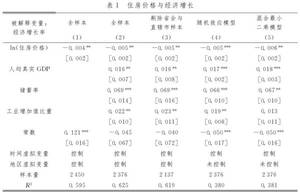 growth_kt为k城市t年的真实GDP增长率,定义为(当年国内生产总值指数-上年国内生产总值指数)/上年国内生产总值指数);ln(houseprice)_ kt为k城市t年的商品房实际销售价格的对数值,定义为ln(商品房销售额/商品房销售面积),商品房销售额以2000年为基期通过省级CPI进行平减。回归结果(见表1)表明,住房价格越高,经济增长率越低。