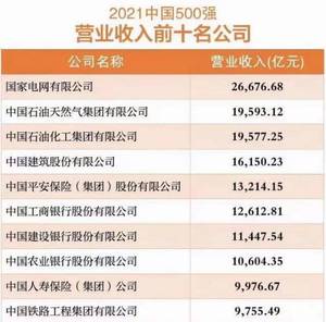 对于入围的500强名单,具体的中国制造企业入围门槛是在110.9亿元,和往年的相比,中国企业500强入围名单的门槛明显的提高了。对于整体的中国企业500强名单,入围门槛提升到了392.36亿元。从这些大致的数字上来看,现在的经济市场越来越有活力了。对于营业收入排在第一名的国家电网有限公司,一直在前面遥遥领先,对于整体的企业来说,也是起到了一个带头的作用。此外还公布了中国2021服务业企业500强,中前三名分别是:国家电网有限公司,中国平安保险(集团)股份有限公司、中国工商银行股份有限公司。