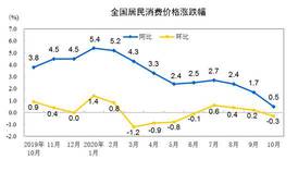 国家统计局10日公布数据显示,2020年10月份,全国居民消费价格(CPI)同比上涨0.5%,涨幅比上月回落1.2个百分点。其中,食品价格上涨2.2%,非食品价格持平。食品价格中,猪肉价格下降2.8%,影响CPI下降约0.13个百分点。1—10月,全国居民消费价格比去年同期上涨3.0%。