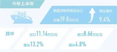 这是关于我们的外贸进出口业务的统计数据,在整个2022年的上半年里,我们的外贸进出口的货物总值已经达到了200,000亿元左右,这个数据同比增长了9.4%了。与此同时,我们的出口量同比也增长了13.2%,进口量同比增长了4%左右。