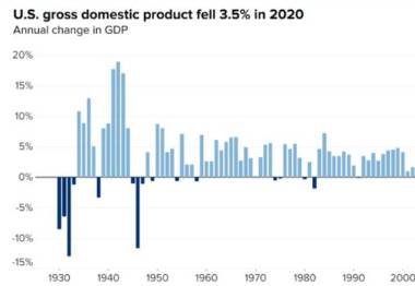 美联社称,这是美国GDP自2009年萎缩2.5%以来首次录得负值,也是自1946年美国经济萎缩11.6%以来最严重的年度挫折。报道称,美国最灾难性的年度经济萎缩发生在1932年,GDP萎缩了12.9%,当时美国正处于大萧条时期。美联社称,这一数据是美国GDP自2009年萎缩2.5%以来首次录得负值,也是自1946年萎缩11.6%以来最严重的年度经济衰退。