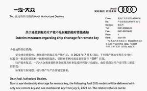 受到疫情影响,全球汽车企业都出现了芯片短缺的问题,这将直接影响汽车的产能,以国产奥迪为例,近日奥迪宣布新车交付暂时提供一把遥控钥匙,等芯片充足后再提供第二把钥匙,这无疑将影响到消费者的用户体验。