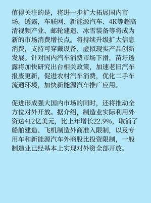 值得关注的是,将进一步扩大拓展国内市场。透露,车联网、新能源汽车、4K等超高清视频产业、邮轮建造、冰雪装备等将成为新的市场消费增长点。将持续升级扩大信息消费,支持可穿戴设备、虚拟现实产品创新发展。针对国内汽车消费市场下滑,苗圩透露将加快研究出台相关政策,加速老旧汽车报废更新,促进农村汽车消费,优化二手车流通环境,加快新能源汽车推广应用。 促进形成强大国内市场的同时,还将推动全方位对外开放。据介绍,制造业实际利用外资达412亿美元,比上年增长22.9%,取消了船舶建造、飞机制造外商准入限制,以及专用车和新能源汽车外商股比投资限制,一般制造业已经基本上实现对外资全部开放。