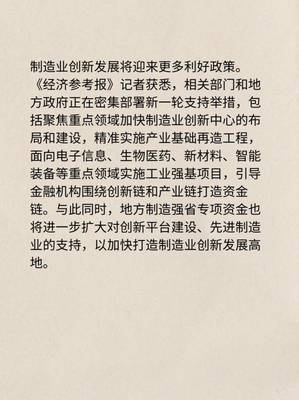 制造业创新发展将迎来更多利好政策。《经济参考报》记者获悉,相关部门和地方政府正在密集部署新一轮支持举措,包括聚焦重点领域加快制造业创新中心的布局和建设,精准实施产业基础再造工程,面向电子信息、生物医药、新材料、智能装备等重点领域实施工业强基项目,引导金融机构围绕创新链和产业链打造资金链。与此同时,地方制造强省专项资金也将进一步扩大对创新平台建设、先进制造业的支持,以加快打造制造业创新发展高地。