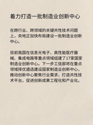 目前我国在信息光电子、高性能医疗器械、集成电路等重点领域组建了17家国家制造业创新中心。下一步工信部将在重点领域择优遴选建设国家制造业创新中心,推动创新中心聚焦行业需求,打造共性技术平台,促进创新成果工程化和产业化。