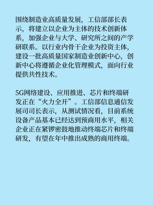 围绕制造业高质量发展,工信部部长表示,将建立以企业为主体的技术创新体系,加强企业与大学、研究所之间的产学研联系。以行业内骨干企业为投资主体,建设一批高质量国家制造业创新中心,创新中心将遵循企业化管理模式,面向行业提供共性技术。 5G网络建设、应用推进、芯片和终端研发正在“火力全开”。工信部信息通信发展司司长表示,从测试情况看,目前系统设备产品基本已经达到预商用水平,相关企业正在紧锣密鼓地推动终端芯片和终端研发,有望在年中推出成熟的商用终端。