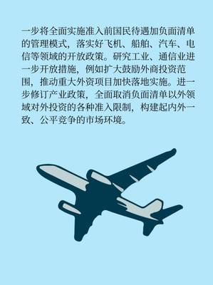 一步将全面实施准入前国民待遇加负面清单的管理模式,落实好飞机、船舶、汽车、电信等领域的开放政策。研究工业、通信业进一步开放措施,例如扩大鼓励外商投资范围,推动重大外资项目加快落地实施。进一步修订产业政策,全面取消负面清单以外领域对外投资的各种准入限制,构建起内外一致、公平竞争的市场环境。