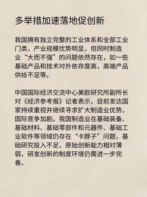 中国国际经济交流中心美欧研究所副所长对《经济参考报》记者表示,目前发达国家持续重视并继续寻求扩大制造业优势,国际竞争加剧。我国制造业在基础装备、基础材料、基础零部件和元器件、基础工业软件等领域仍存在“卡脖子”问题,基础研究投入不足,原始创新能力相对薄弱,研发创新的制度环境仍需进一步完善。
