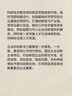 科研攻关要发挥好新型举国体制作用,做好顶层制度设计,加强基础科学研究和企业基础应用研究,打通创新链与产业链,发挥出最大效益。做好公共技术服务体系建设,特别是要为中小企业创新提供好服务,同时进一步完善人才引进体制机制,利用好全球人才资源。