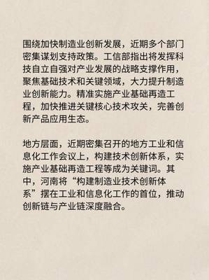 围绕加快制造业创新发展,近期多个部门密集谋划支持政策。工信部指出将发挥科技自立自强对产业发展的战略支撑作用,聚焦基础技术和关键领域,大力提升制造业创新能力。精准实施产业基础再造工程,加快推进关键核心技术攻关,完善创新产品应用生态。